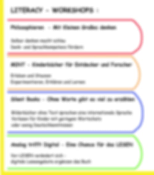 In den Literacy - Workshops stelle ich verschiedene Herangehensweisen vor, wie man mit Bilderbüchern Kinder für das Lesen begeistern kann. Auch hier gebe ich Tipps, mache Vorschläge und erarbeitet, anhand einer großen Auswahl an Kinderbüchern und -medien, mit den Teilnehmern eine Vielfalt an Ideen zur Leseförderung.